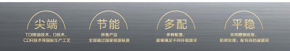 (TDI柴油技術(shù)、D技術(shù)、 CDR技術(shù)等國際生產(chǎn)工藝)、節(jié)能(所售產(chǎn)品 全部通過 排放標(biāo)準(zhǔn))、多配(多種配置, 能夠滿足不同環(huán)境需求)、平穩(wěn)(采用槽鋼底架, 防銹處理,配有 減震塊 )